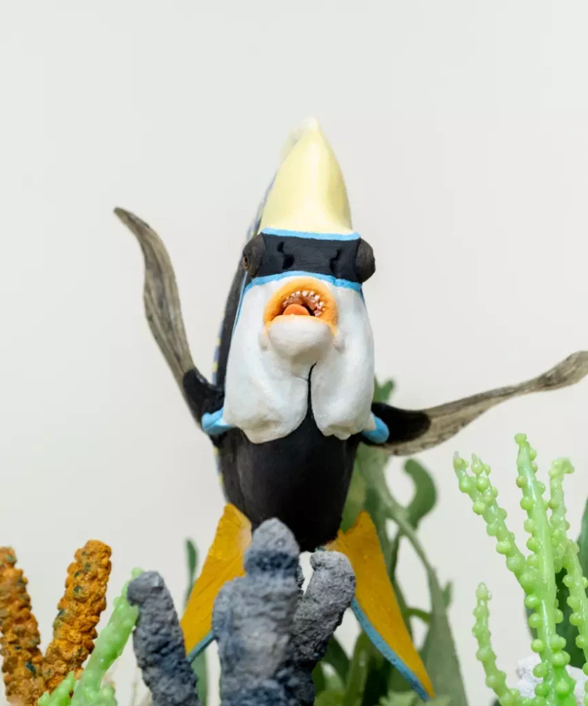 A manifestation of the artist's creative vision, this unique piece of art has been entirely handcrafted. To bring this vision to life, a judicious combination of finely molded and sculpted materials blends the traditional with the contemporary: ceramic for the white and gray corals, the base and the body of the fish; resin and silicone for the various algae and the red coral. The result is a hyper-realistic sculpture that challenges our perception of reality. Surprised, our eye wanders into the sculpture's three-dimensional space. Adopting different points of view and circling around the work, we discover and understand the scene playing out before us, between the fish's lowered right eye on one side, and the eggs representing its future feast on the other. Drawn into the story, we enter the thematic universe of the beauty and death of this marvellous fish, the Pomacanthus imperator.